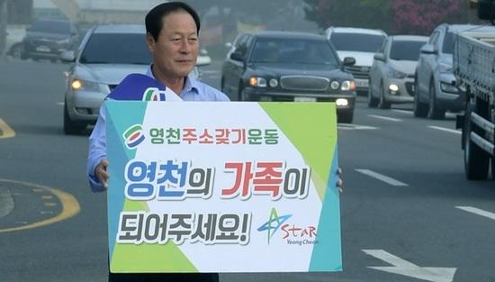 | ▲ 김영석 영천시장 지역 주소갖기 운동 1인 캠페인 모습 © 영천시 제공 |