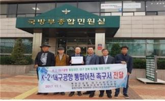3개 지역 시민단체는 통합이전 촉구서를 통해 “정부가 신속한 절차를 이행하여 이전부지를 조기에 확정함으로써 지역주민들 간의 불필요한 논란해소와 갈등예방에 최선의 노력을 해달라”고 건의하고 군공항이전사업에 정부가 주관하여 이전주변지역 지원사업을 적극 시행해줄 것과 민간공항에만 적용하고 있는 75웨클 이상 지역에 대한 소음피해 지원 및 보상을 군공항에도 즉시 시행 해달라고 했다.