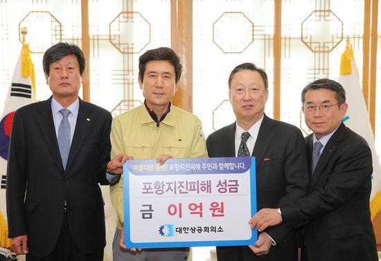 포항상의에 따르면 이날 박용만 대한상의 회장 및 김준동 상근부회장은 포항시청을 방문해 지진피해 복구지원 성금을 전달했으며 이어 포항상의에서 지진피해여파로 침체된 포항지역 경제회복을 위한 대책을 논의했다.