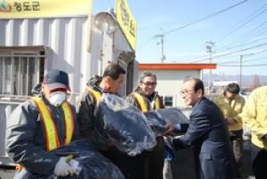 【브레이크뉴스 청도】김가이 기자= 청도군(군수 이승율)은 이승율 청도군수가 지난 30일 고병원성 AI의 관내 유입 및 발생을 막기 위해 운영하는 거점소독시설을 방문해 근무자를 격려하고 방한복을 전달했다고 31일 밝혔다.
