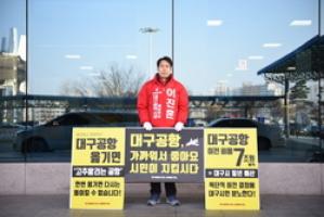 【브레이크뉴스 대구】이성현 기자= 이진훈 대구광역시장 예비후보는 23일 오전 대구공항 청사에서 대구공항 이전을 반대하는 1인 시위를 했다.