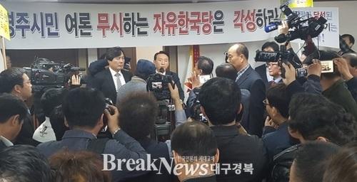 【브레이크뉴스 경주】김가이 기자=자유한국당 경북도당 공천관리위원회가 지난9일 경주시장 경선에서 현 최양식 경주시장을 배제시키고 이동우, 주낙영, 최학철 예비후보 3인을 대상으로 경선을 실시하기로 한 것과 관련 최양식 시장 지지자들이 10일, 이에대한 입장을 밝히려던 경주시 당협위원장인 김석기 의원의 지역사무소를 점거하면서 기자회견이 취소되는 사태가 발생했다.