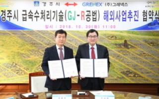 【브레이크뉴스 경주】김가이 기자= 경주시(시장 주낙영)는 30일 대외협력실에서 해외 수처리 전문기업인 ㈜그레넥스(대표이사 국중창)와 경주시급속수처리기술(GJ-R)의 해외사업 추진 및 사업 확대를 위한 기술이전 협약을 체결했다고 30일 밝혔다.