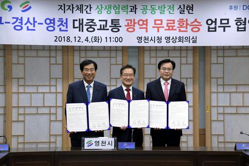 【브레이크뉴스 영천】김상호 기자= 영천시(시장 최기문)는 대구시(시장 권영진), 경산시(시장 최영조)와 4일 영천시청 영상회의실에서 세개 시 공동으로 대중교통 광역 무료환승 추진 협약식을 갖고 대중교통 활성화와 지자체간 상생협력을 위한 상호협력 업무협약(MOU)을 체결했다고 4일 밝혔다.