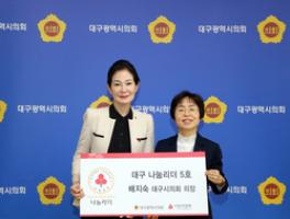 【브레이크뉴스 대구 】이성현 기자= 대구광역시의회 배지숙 의장이 개인자격으로 ‘나눔리더’ 클럽에 가입했다. 나눔리더 클럽은 개인이 1년 이내에 100만원 이상을 일시 또는 약정 기부를 통해 나눔을 실천하는 방안으로 2017년 6월 전국사회복지공동모금회가 만들었다.