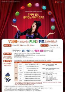 이번 이벤트는 5월 31일까지 새롭게 추가된 펀드상품(9종)에 가입한 고객에게 가입 금액별 상품권을 지급하며, 100만원 이상 펀드상품에 가입하는 고객 중 100명을 추첨해 5만원 상당의 우체국쇼핑상품권을 추가 증정한다.