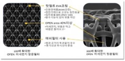 요즘 크게 이슈가 되고 있는 1급 발암물질인 미세먼지를 차단하기 위해 개발한 1세대 '오픈필터'는 친환경 첨단 소재를 활용해 40마이크로미터(㎛) 크기의 미세한 구멍이 뚫려 있는 PET메시 패브릭 필터 위에, 에틸렌비닐아세테이트(EVA)를 열접착 한 제품으로 고성능 정전기력으로 탁월한 먼지 여과율을 가진다.
