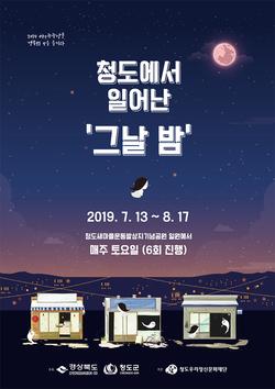 【브레이크뉴스 청도】김상호 기자= 청도우리정신문화재단(이사장 이승율 청도군수)은 오는 13일부터 8월 17일 까지 매주 토요일마다 새마을운동발상지기념공원에서 ‘청도에서 일어난 그날 밤’ 야간관광 프로그램을 운영한다고 1일 밝혔다.