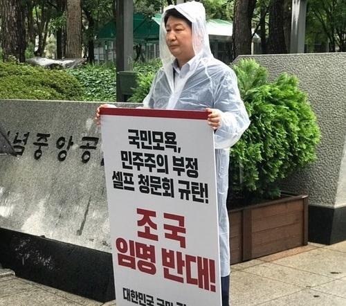 권영진 시장은 3일 낮 12시부터 1시간여 동안 비를 맞으며 대구 중구 2.28기념공원에서 '국민모욕, 민주주의 부정, 셀프 청문회 규탄! 조국 임명 반대!'라고 적고 맨 아래 '대한민국 국민 권영진'라고 쓴 피켓을 들고 시위를 했다.