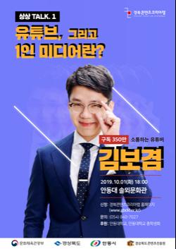 【브레이크뉴스 경북 안동】이성현 기자= 경상북도콘텐츠진흥원(원장 이종수,이하 진흥원)은 오는 10월 1일 구독자 350만 인기 유튜버 ‘보겸’ 의 강연을 시작으로 내년 2월까지 총 7명의 연사를 모시고, 상상톡(TALK)을 진행한다고 19일 밝혔다.