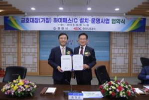 【브레이크뉴스 영천】김가이 기자= 영천시(시장 최기문)는 26일 시청 영상회의실에서 한국도로공사(대구경북본부장 김진광)와 경부고속도로 금호대창(가칭) ‘하이패스IC 설치·운영사업’ 시행을 위한 협약을 체결했다고 26일 밝혔다.