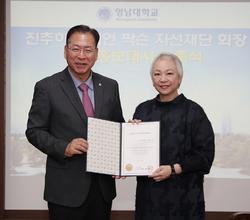 영남대는 지난 28일 영남대를 방문한 진추하 회장이 영남대 서길수 총장으로부터 명예홍보대사 위촉장을 수여받았다고 29일 밝혔다.