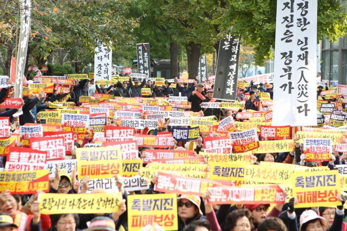 【브레이크뉴스 포항】오주호 기자=지난 2017년 11월15일 포항 촉발 지진 피해를 입은 시민들이 포항지진특별법의 조기 제정을 촉구하는 대규모 상경 시위를 벌였다.
