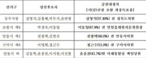 또, 공관위는 광역의원을 선출하는 포항 제 6선거구의 경우, 이동업 전 연일읍개발자문위원장을 공천하는 한편, 안동 제2선거구에서는 60% 지지지를 받은 권광택 전 안동시의원이 공천을 확정지었다. 이밖에 구미 6선거구에서는 정근수 후보가 51%를 얻으면서 공천을 확정지었고, 기초의원을 선출하는 안동 바선거구에서는 윤종찬 후보가 공천권을 따냈다. <저작권자 ⓒ 브레이크뉴스 대구경북 무단전재 및 재배포 금지>