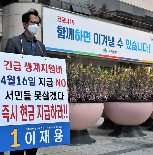 【브레이크뉴스 대구】이성현 기자= 더불어민주당 이재용 대구 중·남구 국회의원 후보는 지난 23일 권영진 시장이 대구시의 긴급생계자금 지원을 총선이후에 지급한다고 밝힌 것과 관련해 시민의 생계를 정치 볼모로 삼지 말라고 24일 밝혔다.