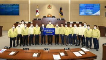 이번 성금은 코로나19 장기화로 인해 유례없는 경기침체를 겪고 있는 도민들의 심각한 상황을 고려, 비회기 중 의원들 간 의견을 미리 모아 제314회 임시회 개회 첫날에 전달식을 갖게 된 것이다.