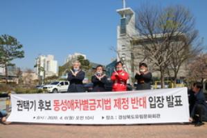 권 후보는 6일 안동종교타운 일원에서 김명호 선대위원장(전 도의원), 담수회 김성규 사묵구장, 안동기독교청년회 배재일 이사장 등과 공동 입장문을 내고, “동성애차별금지법은 자유대한민국의 공동체와 소중한 가정문화를 파괴하고, 개인의 의사표현 자유를 제약하는 법안”이라며 “법 제정을 단호히 반대한다”고 밝혔다.