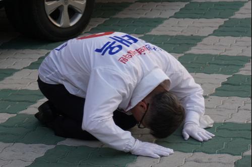 【브레이크뉴스 대구】이성현 기자= 무소속 대구 북구갑 정태옥 후보가 손을 바닥에 대고 주민들에게 큰 절을 올리는 ‘9절 유세’를 이어가고 있다.