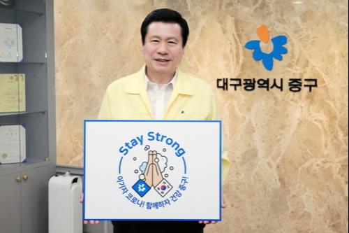【브레이크뉴스 대구】이성현 기자= 대구시 중구청은 9일 류규하 구청장이 코로나19로 힘든 시기를 보내고 있는 많은 분들에게 희망을 전달하기 위해 ‘이기자 코로나! 함께하자 건강중구!’라는 문구가 담긴 팻말을 들고‘스테이 스트롱(Stay Strong) 캠페인’에 동참했다고 밝혔다.