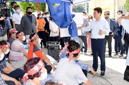 ▲ 군위현장사무실 앞에서 농성중인 추진위와 대화하는 이철우 경북도지사 ©