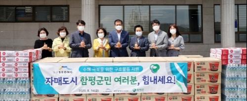 【브레이크뉴스 대구】이성현 기자= 대구 수성구(구청장 김대권)는 집중호우로 수해 피해를 입은 자매도시 전남 함평군과 경남 거창군에 구호물품을 전달했다고 18일 밝혔다.