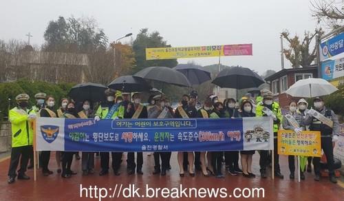 [Break News Uljin] Reporter Woo-geun Lee = The Uljin Police Station held a traffic safety campaign to prevent traffic accidents for children on the back road in front of the main gate of Uljin Elementary School at 8 am on the 17th.
