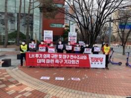 진보당 대구시당과 민주노총 대구지역본부는 기자회견을 통해 “LH 임직원들의 범죄행각은 집값을 잡겠다는 정부의 정책을 비웃음거리로 만들고 국민들에게는 엄청난 실망과 분노를 안겨다주었다”면서 “LH에서 조성하는 대구 연호지구, 대구도시공사의 대구대공원, 금호워터폴리스 등 사업이 본격적으로 추진되기 전 토지 거래량이 급증하는 양상을 보이는 등 투기 의혹이 제기 되고 있다”고 지적했다.