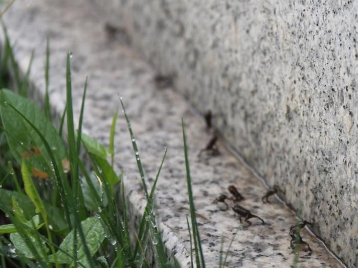 After a month of hatching and transformation, hundreds of thousands of baby toads start moving to Mt. Uksu around May using a humid environment with rain.