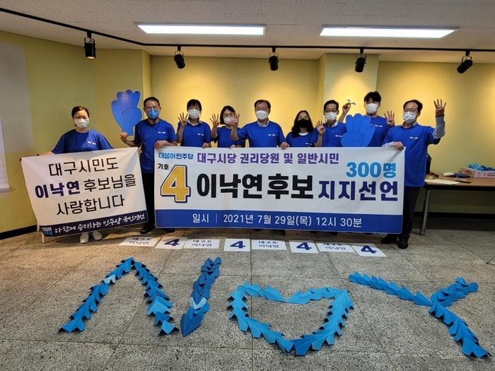 As the Democratic Party of Korea (Democratic Party) faces the registration period and voting ahead of the presidential election, about 300 members of the Democratic Party's Rights Party and ordinary citizens in Daegu declared their support for Candidate Lee Nak-yeon.