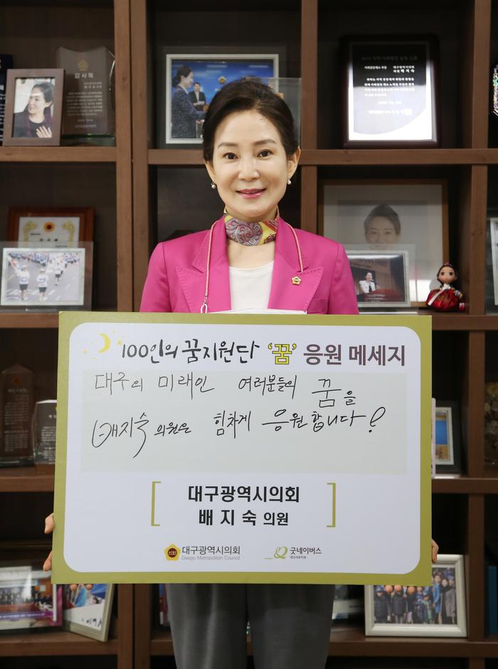 배지숙 의원은 “대구의 미래인 아동들의 꿈을 힘차게 응원한다”라고 적은 메시지를 전하면서 “의정활동을 통해 우리 아이들이 꿈을 이룰 수 있도록 최선을 다해서 돕겠다”고 전했다.