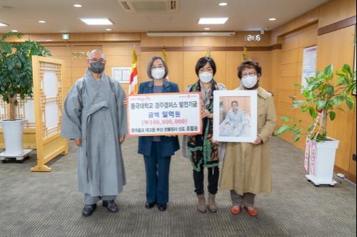 The donor's older sister, Jo Jung-ja, said, "More than giving money to his daughter, Gotham, who is the head of Cheonbuljeongsa Temple, said that it is more important to pass on the spirit that mother showed her how to live as a Buddhist, and she suggested donating to Dongguk University's Gyeongju Campus." He said, "I couldn't donate more, but please know that the heart of donation is more precious than 100 billion won."