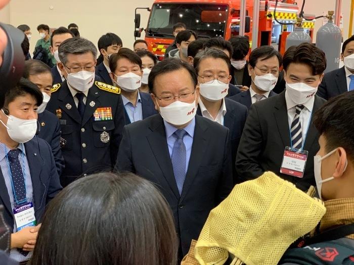 24일 김부겸 국무총리가 대구 엑스코(EXCO)에서 열린 제17회 국제소방안전박람회에서 참가한 가운데 기자들을 만나 여러 가지 현안에 대한 입장을 전했다.