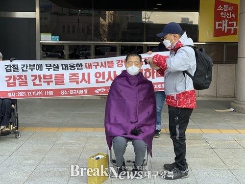 그러면서 "국민권익위원회의 청렴도 평가가 최하위를 기록하고도 대구시는 상식 이하 수준의 제 식구 감싸기 식으로 일관하고 있다"면서" 전 직원 대상 전수조사와 갑질 간부를 즉시 인사 조치할 것"을 요구하며 삭발식을 진행했다.