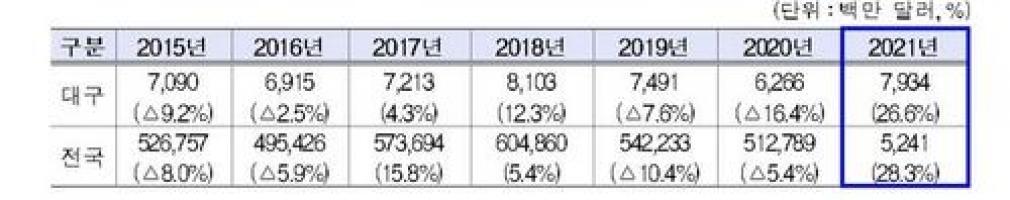 <구글 번역으로 번역한 영문 기사의 전문 입니다. 번역에 오류가 있을 수 있음을 밝힙니다.> Last year, exports to Daegu recorded a high figure that surpassed the base effect of COVID-19.