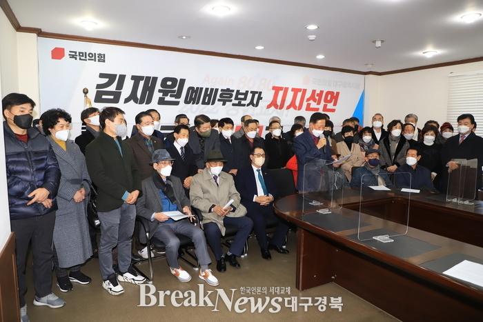 Local government officials announced on the 26th that they support Kim Jae-won, a representative of parachute personnel who will run in the Daegu Jungnam-gu parliamentary by-election to be held along with the March 9th presidential election. Former Director Se-dal Song stood in front of the press conference that day.