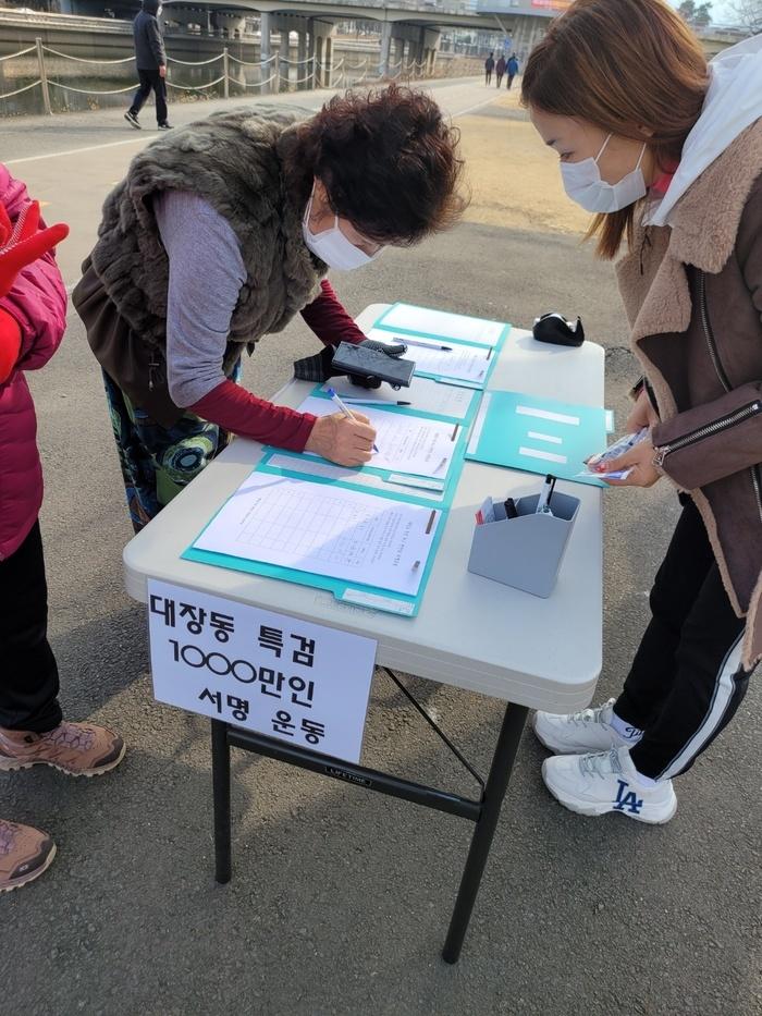 대장동 특검 촉구 천만인 서명운동 대구지부는 신천 둔치 대봉교 인근에 서명대를 설치하고 시민들의 자발적인 서명을 접수 하였으며 서명대를 설치한 지 한 시간 반 정도에 백 명에 육박하는 서명이 접수되어 대구지부 관계자들도 시민들의 자발적 서명 열기에 다시 한번 놀랐다는 후문이 전해진다.