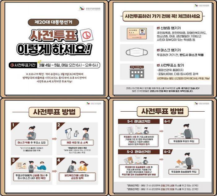 To ensure that voters can vote with confidence, the National Election Commission will conduct quarantine at all advance polling places the day before and every day during the early voting period after voting closes. Voters must wear a mask and observe the 'People's Code of Conduct for Voting Participation', such as temperature checks at polling places, hand sanitizing, and distancing from other voters.