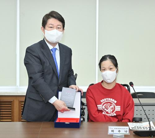 대구탈시설장애인자조모임(리더 이수나)은 4일 권영진 대구시장에 감사패를 전달했다. 권 시장이 민선 6,7기 대구시장을 맡으면서 이들 탈시설 장애인자립지원 정책을 선도적으로 추진해 준 것에 대한 감사의 표시라고 했다.