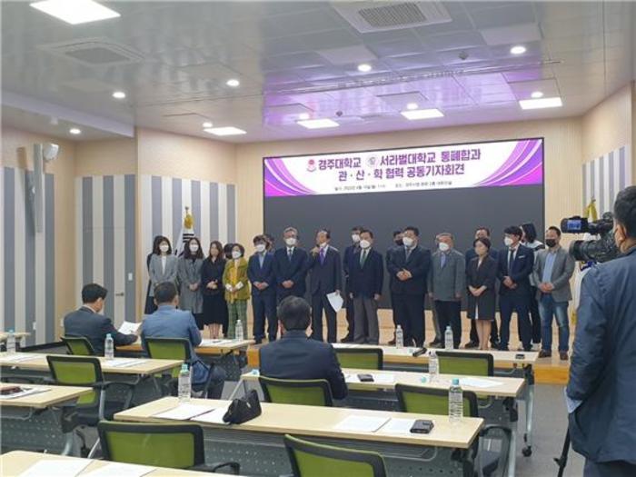At 11 am on the 18th, Gyeongju City Hall conference room, Founder Il-Yoon Kim of Wonseok Academy, President Doo-Hwan Jeong of Seorabeol University, Vice President of Planning and Management Lee Dong-Hwan of Gyeongju University, Bon-Ki Koo, Vice President of International Studies and Education, and officials from both schools attended the declaration of the merger and closure of Gyeongju University and Seorabeol University. A press conference was held for