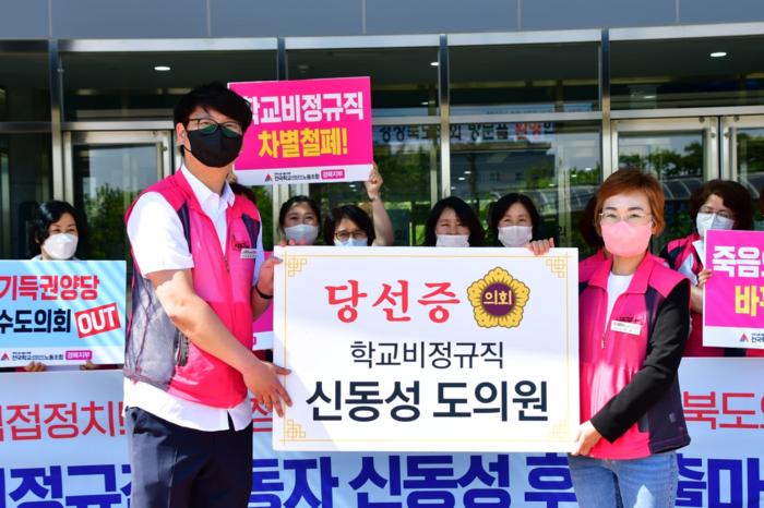 이날 기자회견에는 약 20여 명의 학비노조 간부들이 참가했으며 신동성 도비례후보에게 당선증과, 진보당에 정당투표하는 퍼포먼스를 진행했다.