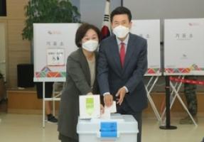 Pohang Mayor Lee Kang-deok started the election schedule by voting in advance with his spouse this morning on the first day of the 8th National Simultaneous Local Election Advance Voting.