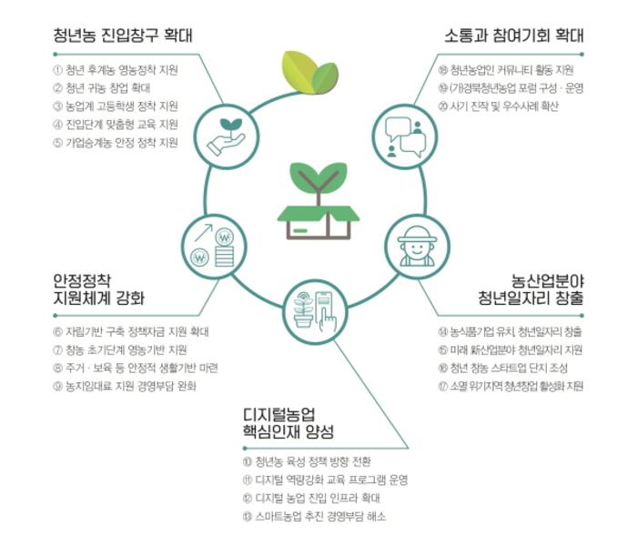 이를 위해 청년 후계농에 대한 영농정착지원, 청년층 귀농 확대, 농과계 고등학생 정착지원, 가업승계 촉진 및 경영기반 개선 지원, 스마트팜 혁신밸리와 경북농민사관학교 등을 통한 교육 및 멘토링 등을 지원한다.