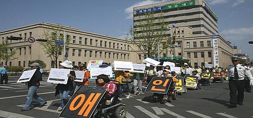| ▲ 장애인들이 사회적, 제도적차별에 항의하며 시청 앞을 행진하고 있다. © 정창오 기자 | | 지난 6월18일 장애인차별금지추진연대(이하 장차연)와 전국의 31개 장애인단체가 서울 마포 합정동 마리스타교육수도회 신관에서 1577-1330 장애인차별상담전화 전국네트워크 출범 및 협약식 기자회견을 가진지 28일 만인 15일부터 대구경북에서도 전국연결망을 개통하고 장애인에 대한 부당한 차별에 대한 상담에 들어갔다. 대구사람장애인자립센터와 대구여성장애인연대는 대구와 경북에 거주하는 장애인들의 인권을 보호하고 침해당한 권리를 구제하는데 커다란 전환점이 될 것이라고 기대를 표명하고 있다. 대구사람장애인자립생활센터의 이연희 사무국장은 1577-1330 전화에 대해 “차별을 당하고도 그저 장애를 가졌다는 이유만으로 참아야만 했던 사람들을 위한 전화”라면서 “장애인차별금지법에 따라 장애인에 대한 차별은 이제 명백한 범죄행위”라고 강조했다.