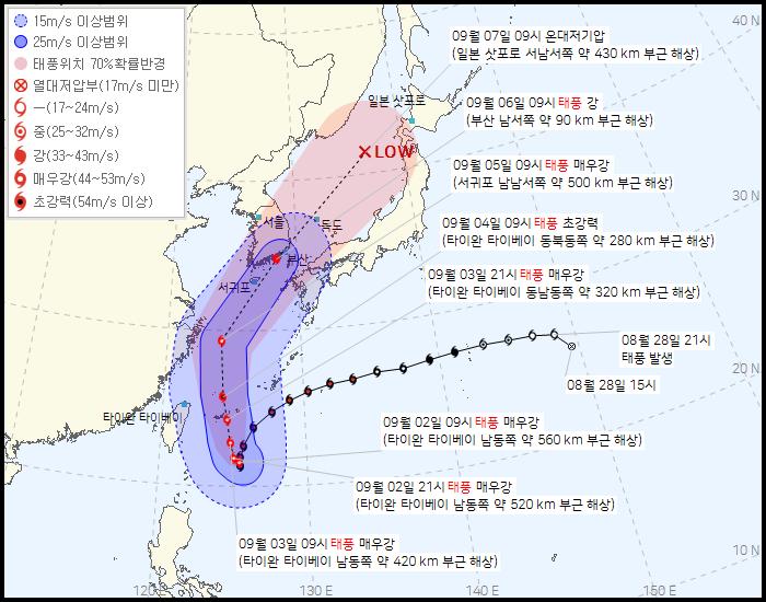 If Hinnamno landed on the Korean Peninsula, its central pressure and maximum wind speed are expected to exceed 950 hPa. The wind is also expected to be around 43-45 ㎧. Considering that Typhoon Sara, which hit the Korean Peninsula in 1959, was 951.5 hPa, it can be said to be a fairly strong typhoon. In particular, much more damage is expected than Sara' and 'Cicada' in that it comes with both wind and rain.
