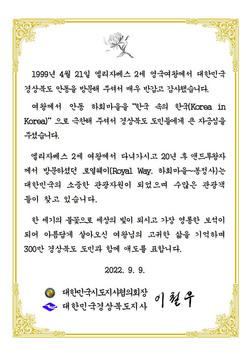 “1999년 4월 21일 엘리자베스 2세 영국여왕께서 대한민국 경상북도 안동을 방문해 줘 매우 반갑고 감사했다. 여왕께서 안동 하회마을을‘한국 속의 한국(Korea in Korea)’이라며 극찬했던 것을 감사한다. 경죽도민에게는 큰 자긍심이었다”