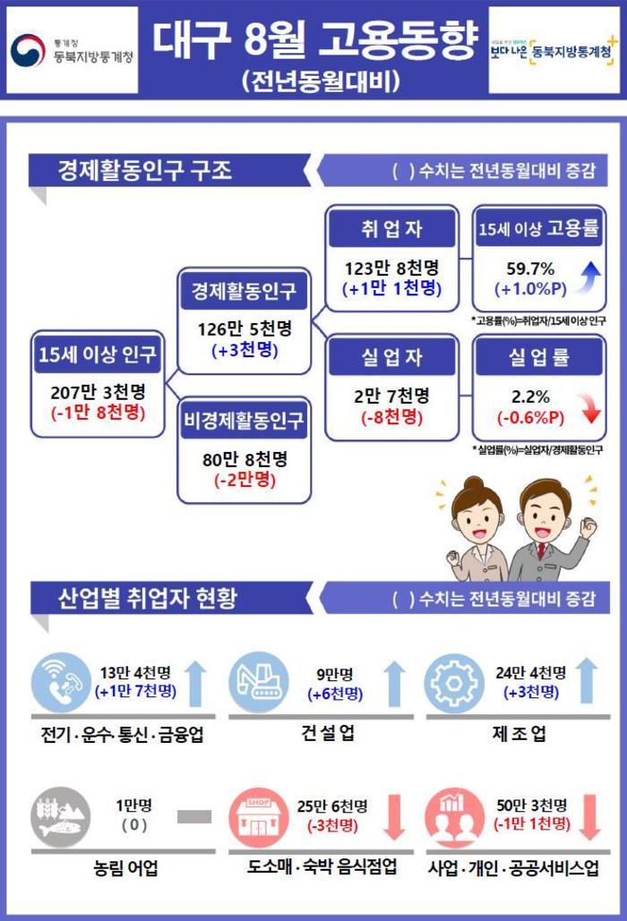 취업자수는 8월 기준 123만 8천 명으로 전년 동월대비 1만 1천 명(0.9%) 증가했다. 성별로는 남자 69만 7천 명으로 5천명(0.8%),여자는 54만 1천 명으로 6천명(1.1%) 각각 증가했다. 이들이 취업한 산업분야를 살펴보면 사업․개인․공공서비스업(-1만 1천명), 도소매․숙박음식점업(-3천명)에서는 감소했다.