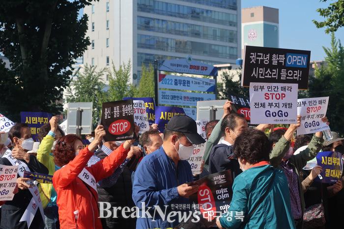 “대구 신청사 부지 일부 매각 반대…누구 맘대로!”대구시청사 바로 세우기 시민연대 30일 대구시청 앞에서 촉구 대회 열어