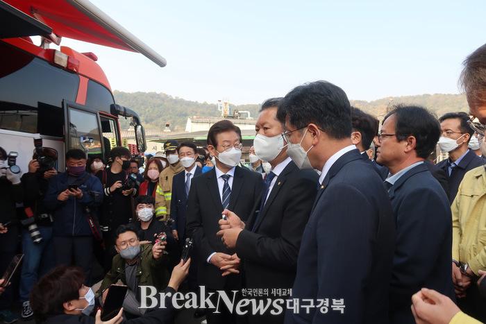 【브레이크뉴스 대구】박은정 기자=이재명 더불어민주당 대표가 28일 오전 대구 북구 농수산물도매시장(매천시장) 화재 현장을 찾아 피해 상황에 대한 소방당국의 브리핑을 듣고 있다.