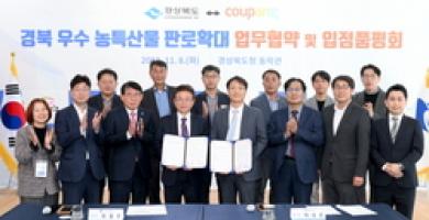 Gyeongsangbuk-do and Coupang, a leading e-commerce company, announced on the 8th that they signed an agreement to expand the online agricultural and special product distribution infrastructure at the Dongrak-gwan of the Gyeongbuk Provincial Office and will expand sales channels for local agricultural specialties.