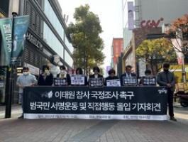 At 11 a.m. on the 10th, the Daegu City Party of the Justice Party held a press conference to call for a national investigation into the Itaewon disaster and launch a nationwide signature movement and direct action.